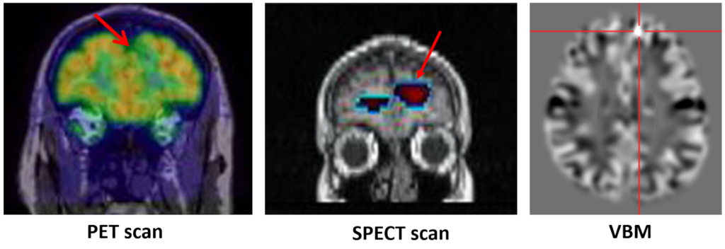 ⦁ ผู้ป่วยที่ไม่มีสาเหตุจำเพาะ แต่ไม่ตอบสนองต่อการรักษาด้วยยากันชัก 2 ชนิดขึ้นไป และอาการชักมีผลเสียต่อคุณภาพชีวิตของผู้ป่วย ซึ่งในปัจจุบัน ผู้ป่วยในกลุ่มนี้ แม้ว่าจะไม่มีรอยโรคจากการตรวจ MRI หรือ มีคลื่นชักกระจายหลายตำแหน่งในสมอง ซึ่งในสมัยก่อนอาจจะผ่าตัดไม่ได้ แต่ด้วยวิวัฒนาการการผ่าตัดได้ก้าวหน้าไปมาก มีเทคนิคการตรวจทางห้องปฎิบัติการหลายอย่างเพื่อสามารถหาตำแหน่งกำเนิดชัก ไม่ว่าจะเป็นการตรวจการไหลเวียนของเลือดไปที่สมองด้วยสารไอโซโทป (SPECT scan) การตรวจหน้าที่สมองด้วย positron emission tomography (PET Scan), การตรวจภาพคลื่นแม่เหล็กไฟฟ้าแบบ 3 มิติ (voxel-based morphometric: VBM) เป็นต้น (ดังรูปที่ 2)