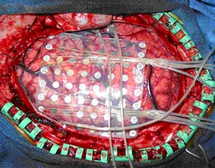 ⦁ การจับจุดชักโดยการวางขั้วไฟฟ้าที่ใต้เยื่อหุ้มสมองส่วนดูรา (subdural electrode) (ดังรูปที่ 3)เป็นผ่าตัดที่ตรวจคลื่นชักบนผิวสมองที่แม่นยำกว่าการตรวจแบบวางขั้วไฟฟ้าบนหนังศีรษะปกติ