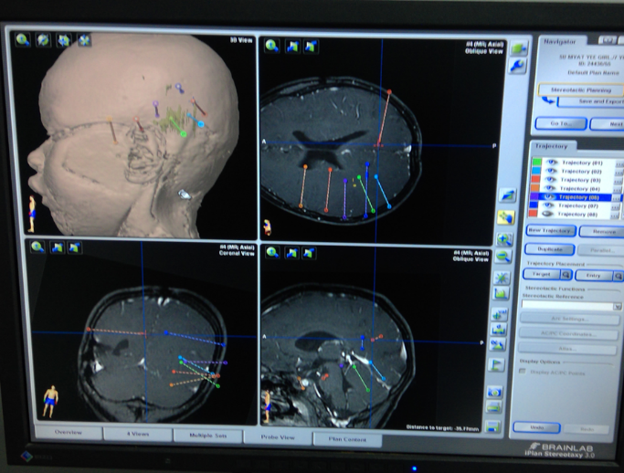 รูปที่ 4 การผ่าตัดโดยการฝังขั้วไฟฟ้าลงไปในเนื้อสมอง(Stereoelectroencephalography: SEEG)