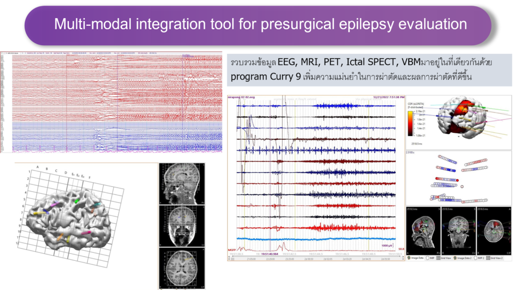 - มีบริการ ตรวจ multi-modality imaging โดยใช้ software Curry 9 ที่ทันสมัย สามารถใช้ข้อมูลต่างๆของ MRI, VBM, PET, SPECT, fMRI, Electroencephalography source imaging analysis มาช่วยในการหาจุดกำเนิดชักได้แม่นยำ